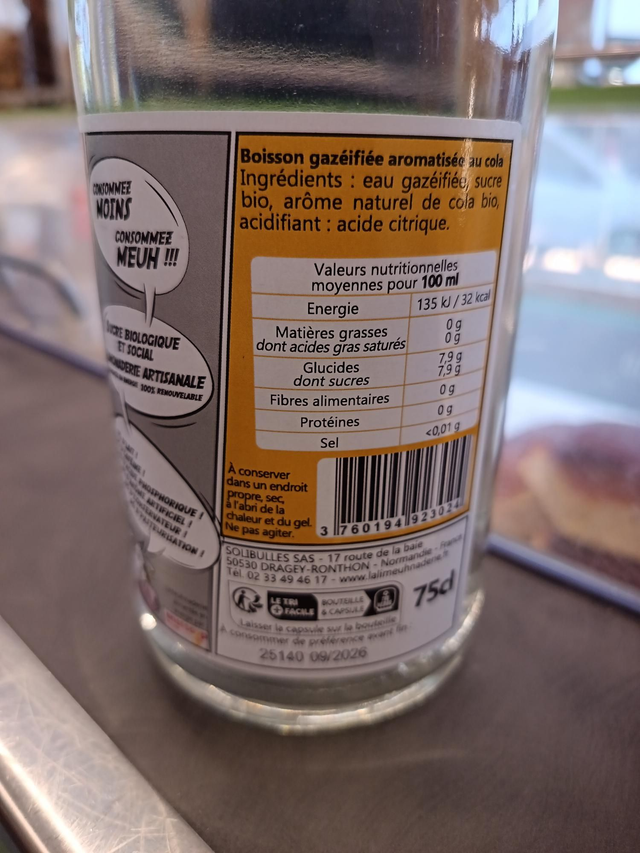 Meuh cola format 75 cl sucre biologique et social, boisson produite par une limeuhnaderie artisanale alimentée en électricité par enercoop (100% renouvelable)